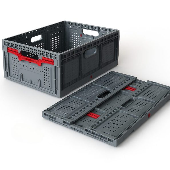 Caixa plástica dobrável com ventilação e estrutura robusta, ideal para armazenamento e transporte no setor logístico, agrícola, comercial ou doméstico. Fabricada em plástico de alta qualidade, esta caixa possui pegas ergonómicas e um sistema de fecho rápido em vermelho que garante segurança e estabilidade ao empilhar.