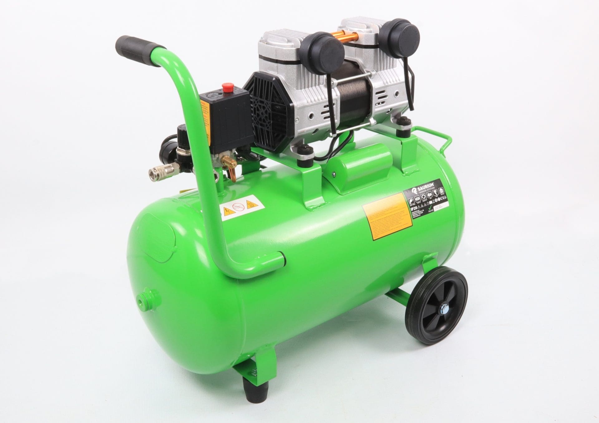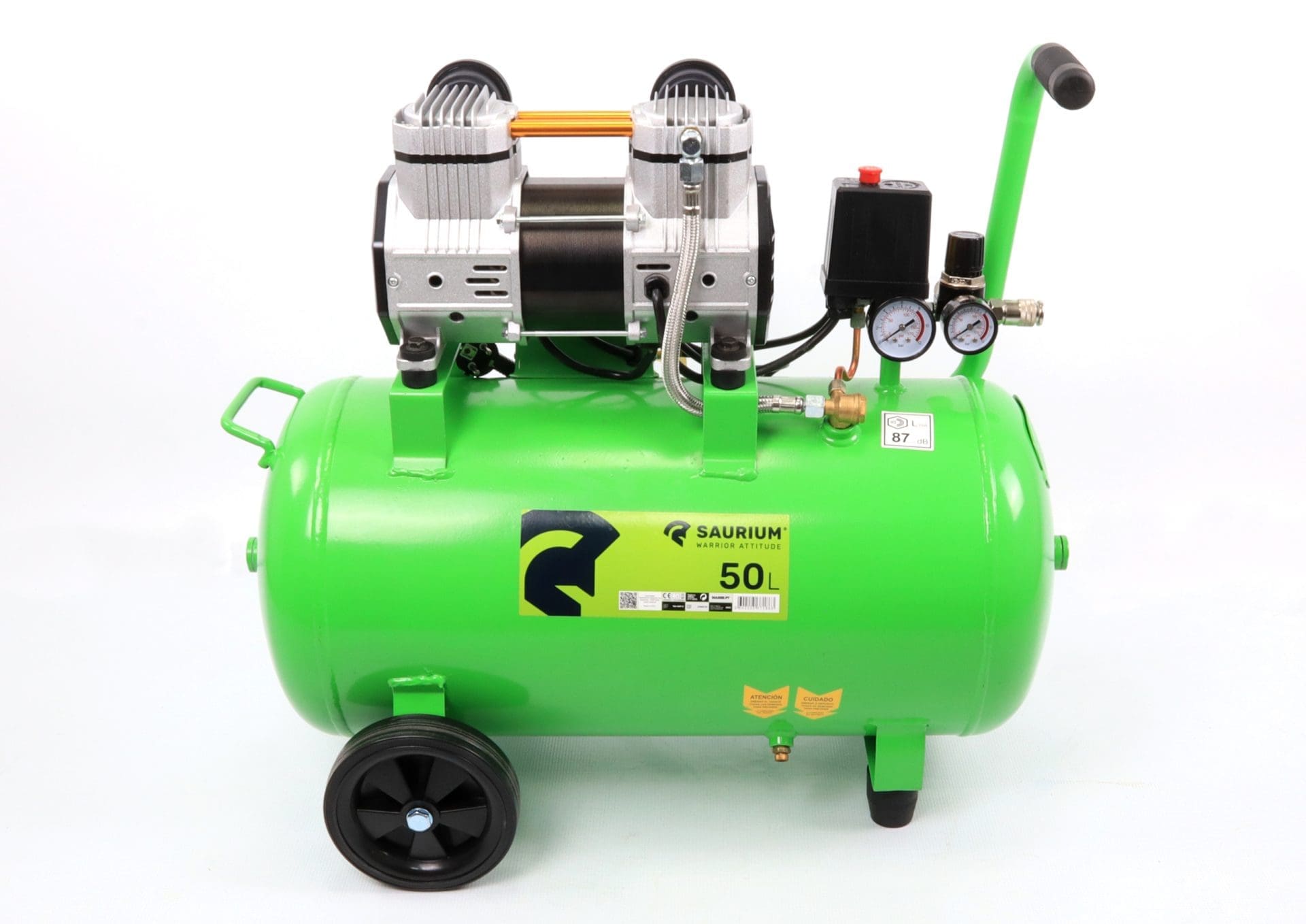 A alimentação 230V / 50Hz permite uma utilização simples em instalações monofásicas correntes, enquanto o conjunto com 2 rodas facilita o transporte e a movimentação do equipamento no local de trabalho. O nível sonoro de 87 dB coloca-o numa gama intermédia, aceitável para esta categoria de compressor portátil.
