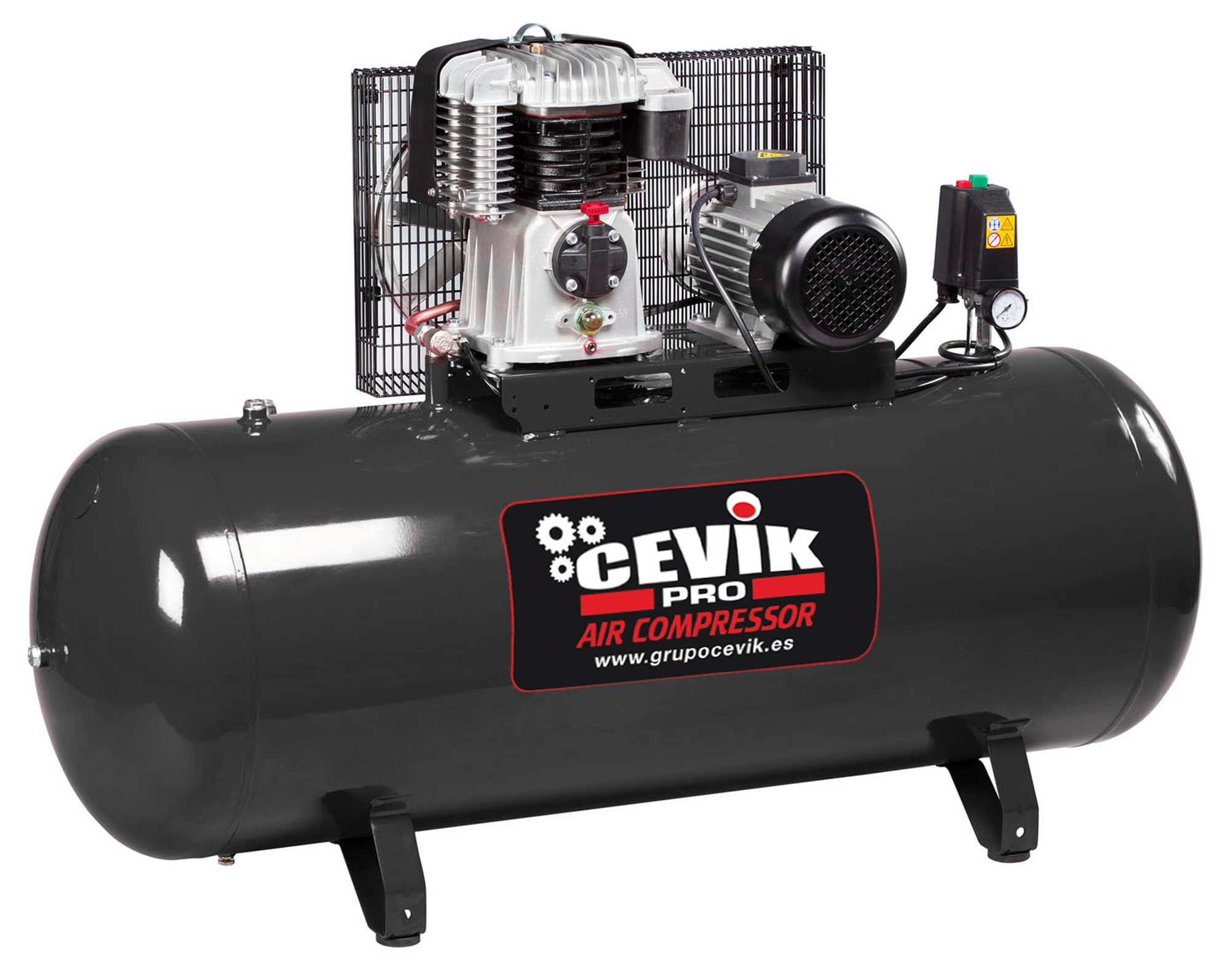 Compressor de ar de correias com cabeça de dois estágios, alto desempenho, cilindros de ferro fundido para longa vida útil útil, equipado com grandes coletores para melhor refrigeração, protetores em cinta de aço resistentes para um proteção ideal de partes móveis Design compacto e robusto, motor de indução.