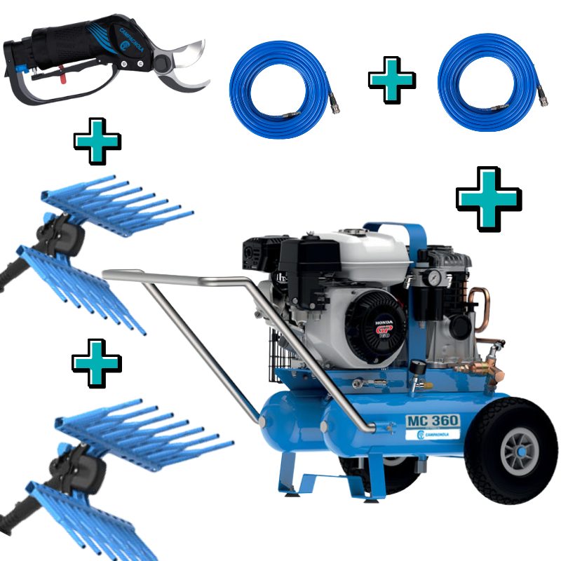 Kit Campagnola motocompressor MC 360, 2 varejadores Tuono Evo, 2 mangueiras e tesoura Victory. Potente, compacto e pronto para colheita profissional.