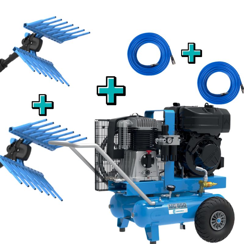 O Kit Profissional MC 650 + Tuono Evo da Campagnola combina a potência e autonomia do motocompressor diesel MC 650 com a robustez dos varejadores Tuono Evo, criando uma solução completa para campanhas intensivas de colheita em olival, amendoal e explorações similares. O MC 650 assegura débito de ar constante e pressão estável, mesmo em uso prolongado, enquanto os dois varejadores permitem trabalho em simultâneo, duplicando o rendimento da equipa.