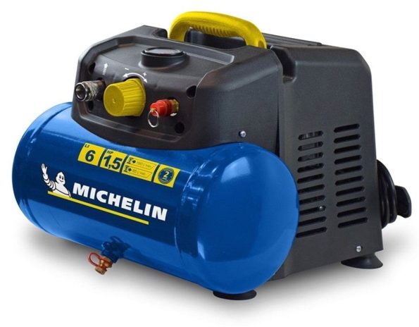 Compressor Michelin 6lts 230v com transmissão direta. Possui motor monocilíndrico de 1,5 CV que não necessita de lubrificação (livre de manutenção), com cilindros em linha. O fluxo de ar de admissão é de 160 l/min. A capacidade do tanque é de 6 litros, o que lhe confere ótimo armazenamento com um nível máximo de ruído de 75 dB. pressão máxima 8 bar.