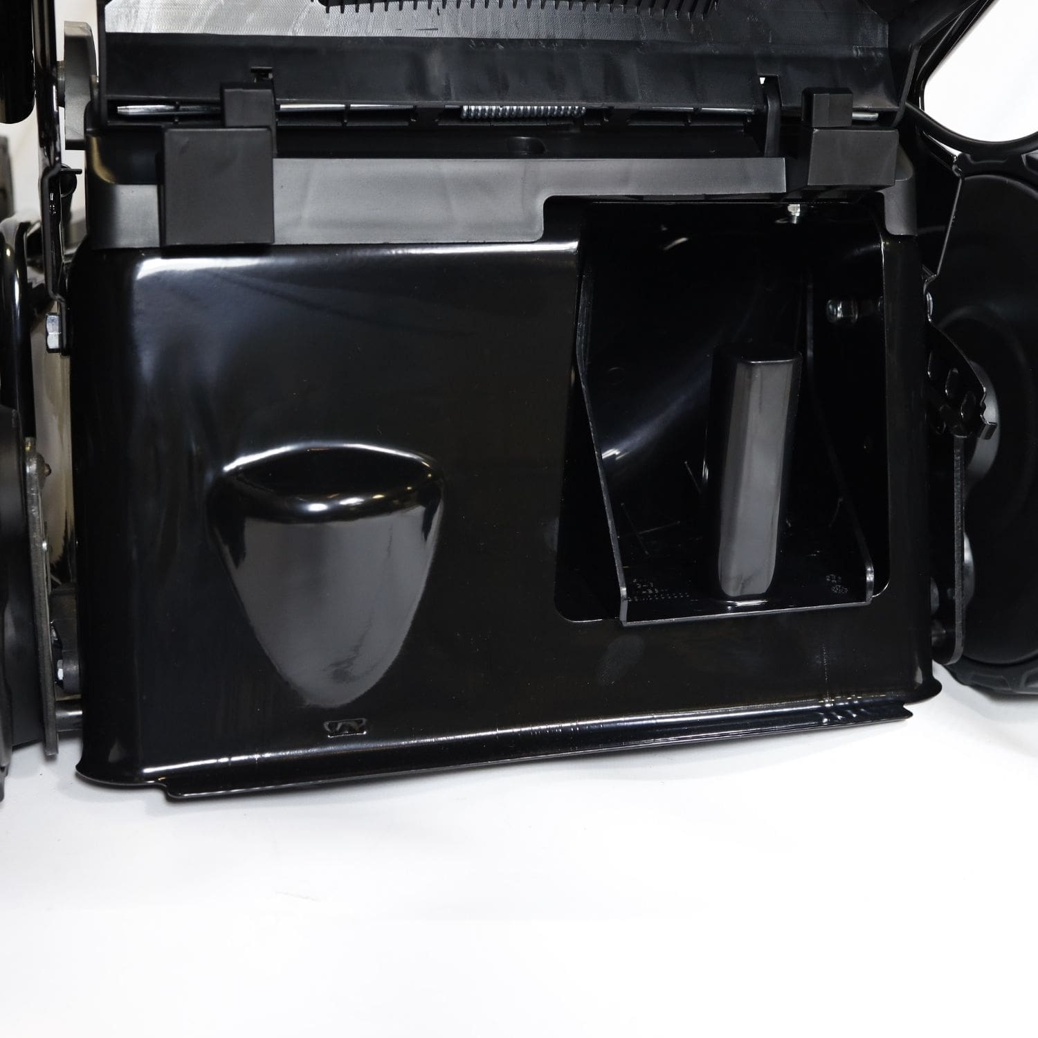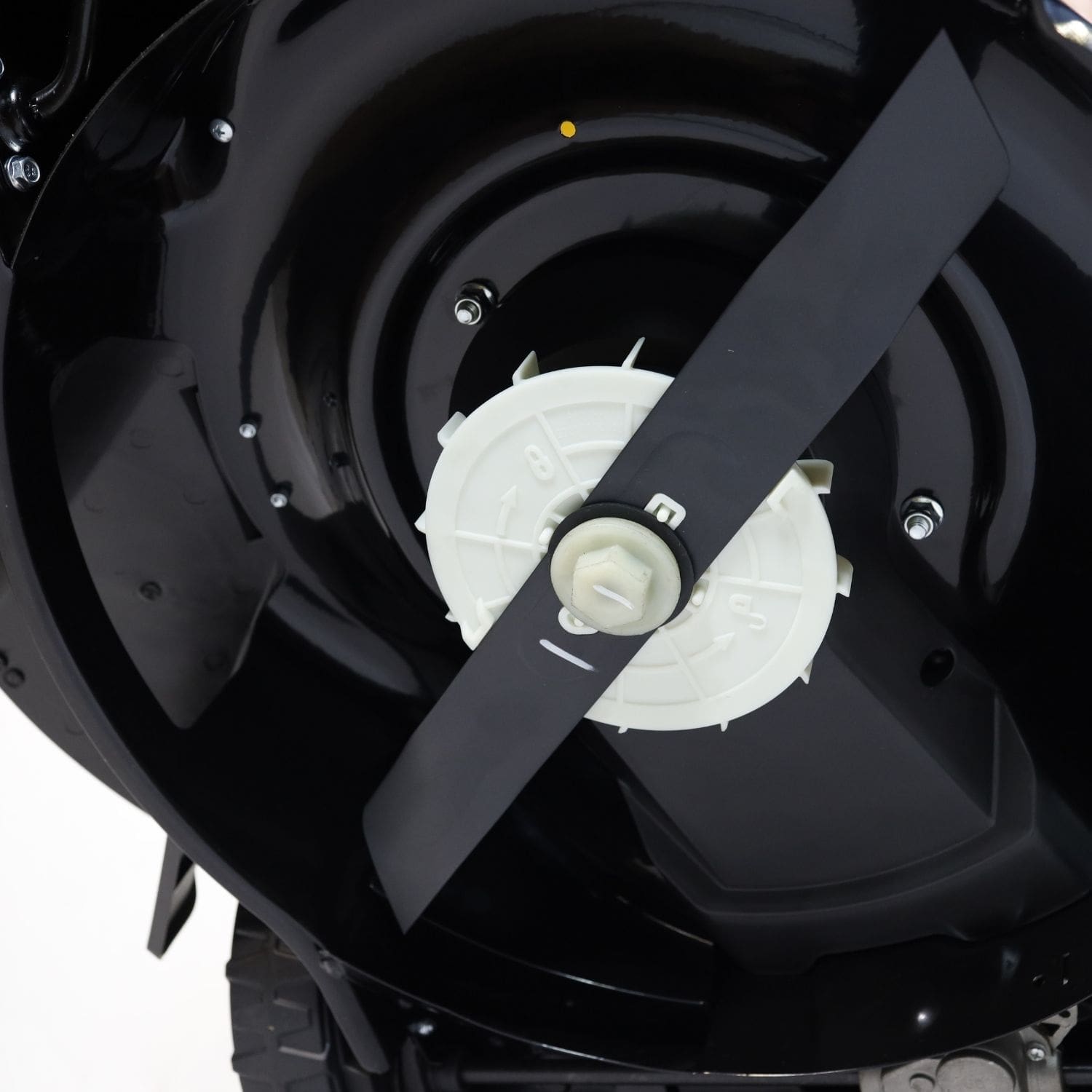 Chassi em aço resistente com saída lateral e traseira, mulching, recolha em saco semirrígido de 45l, com indicador de enchimento. Controlo centralizado da altura de corte e largura de corte de 410 mm.
