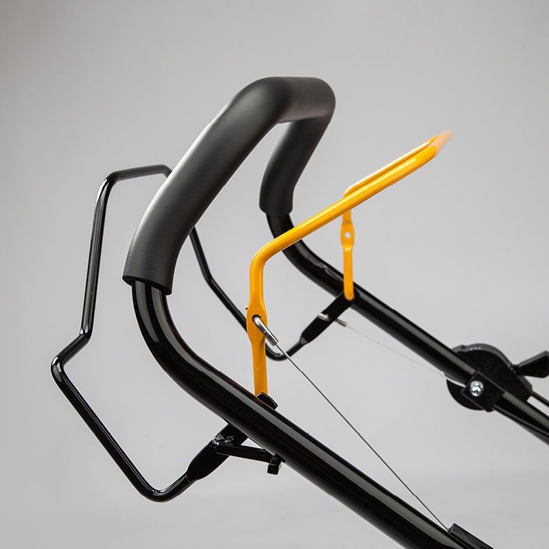 Chassi em aço, com largura de corte de 460 mm, saída traseira e recolha em saco de 60 l com indicador de enchimento. As saídas de ar laterais e o desenho de sua lâmina melhoram o enchimento do saco ou a expulsão de restos.