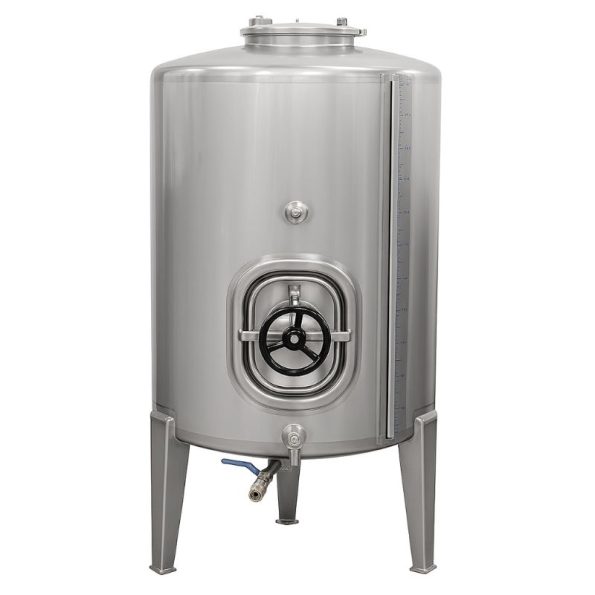 Cuba em aço inoxidável com fundo plano e porta retangular, ideal para armazenamento de grandes volumes em ambientes industriais e vinícolas.