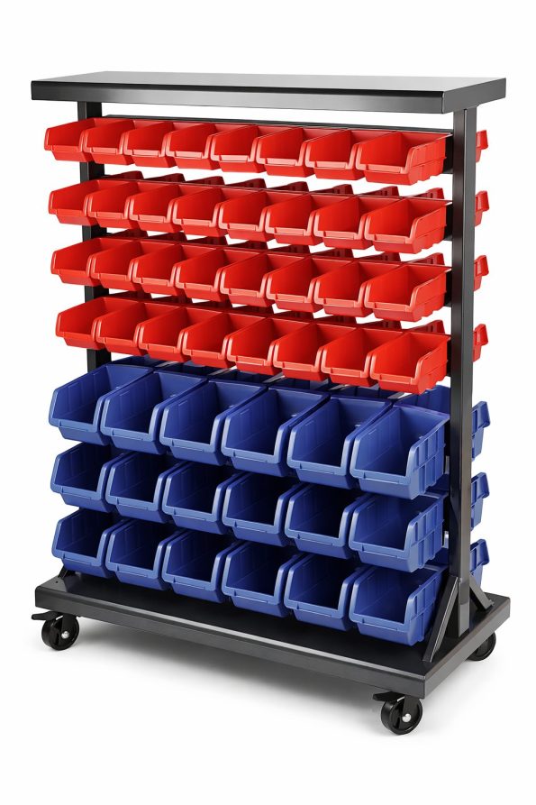 O conjunto inclui caixas vermelhas e azuis de diferentes dimensões, ideais para separação por tipo de peça, referência ou aplicação, tornando este sistema particularmente indicado para manutenção, logística, indústria e retalho técnico.