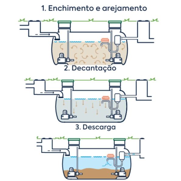 Parte das lamas biológicas permanece no sistema para tratar os ciclos seguintes, assegurando estabilidade e continuidade do processo. O excesso de lamas é removido periodicamente, de acordo com as recomendações técnicas do fabricante.