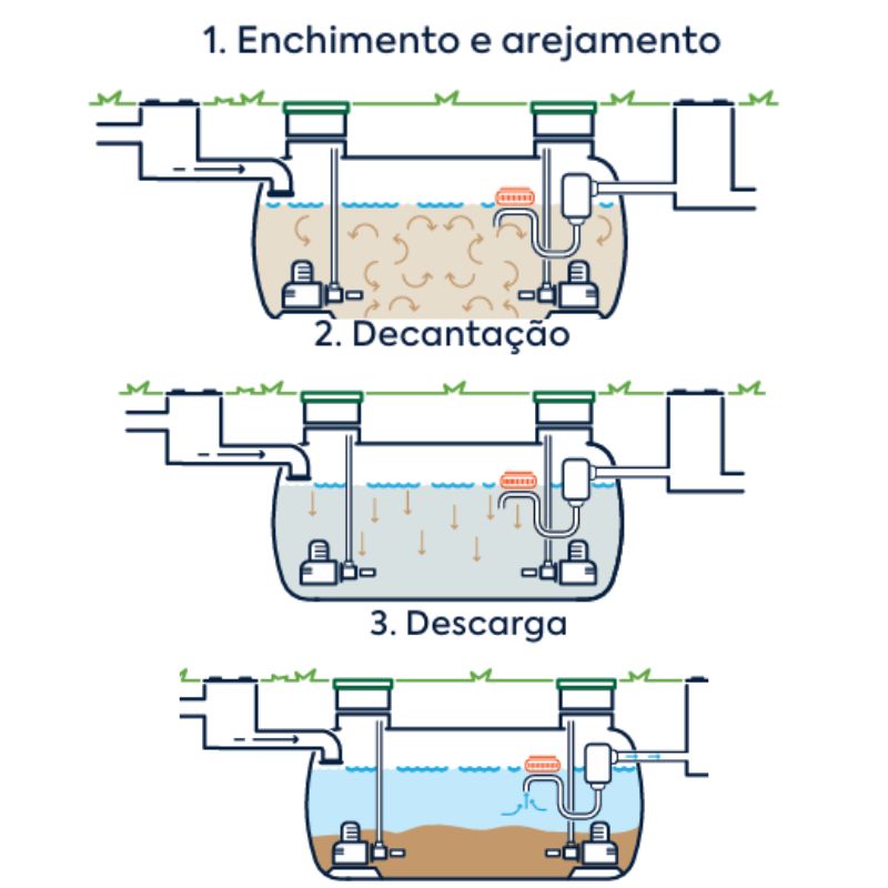 A tecnologia SBR baseia-se num processo em lotes sequenciais, que combina três etapas principais: arejamento, decantação e descarga. Durante os ciclos de funcionamento, o sistema agita o efluente e injeta oxigénio, criando condições ideais para que os microrganismos decomponham a matéria orgânica presente. No final de cada ciclo, a água tratada é libertada em conformidade com as exigências ambientais em vigor.