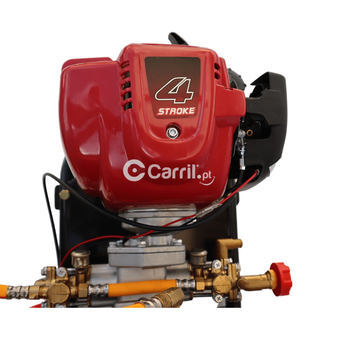 Equipado com motor a 4 tempos, oferece maior durabilidade e menor manutenção face aos modelos 2T. Inclui mangueira de 15 metros com enrolador integrado, bomba de alta pressão com dois pistões e pistola regulável para uma aplicação controlada.