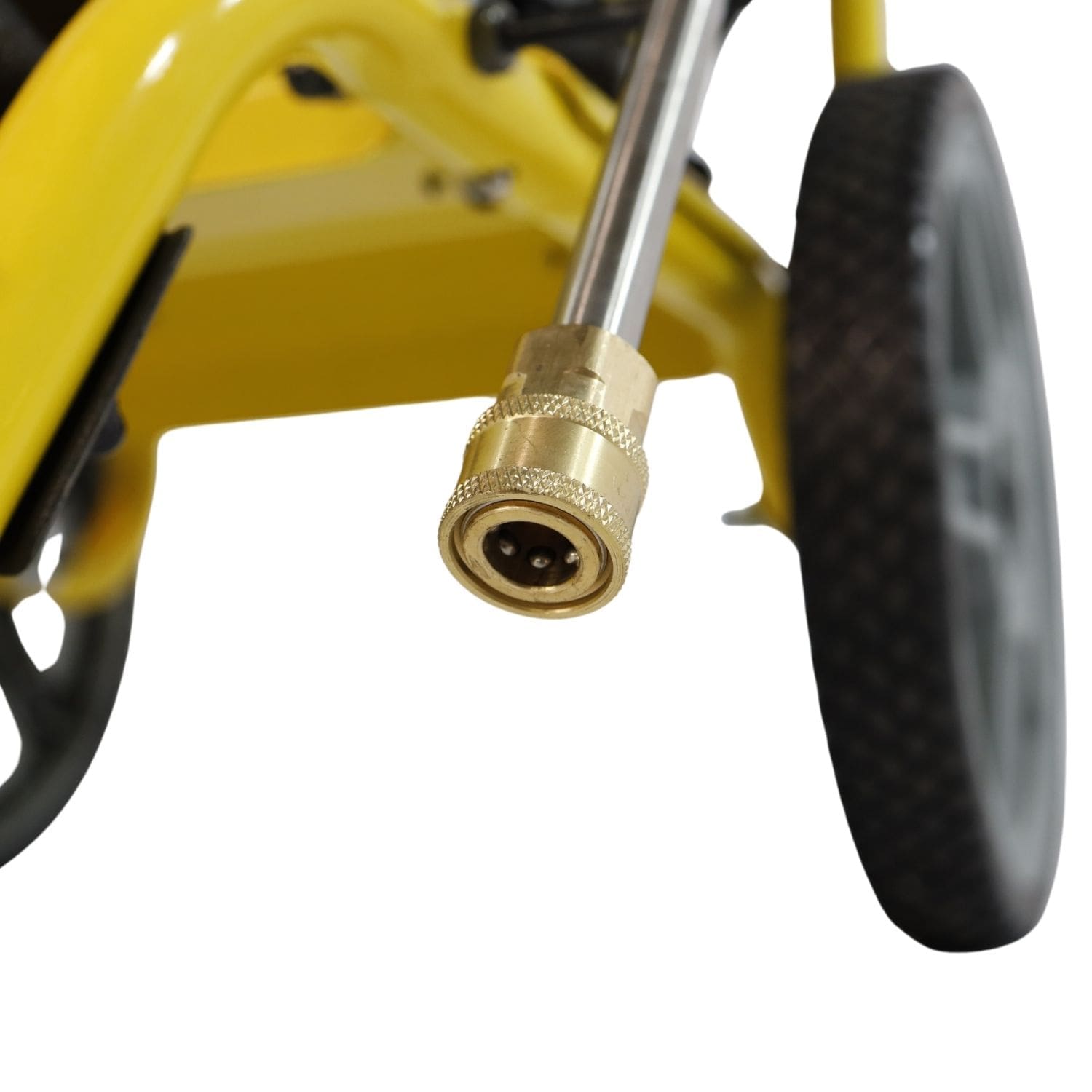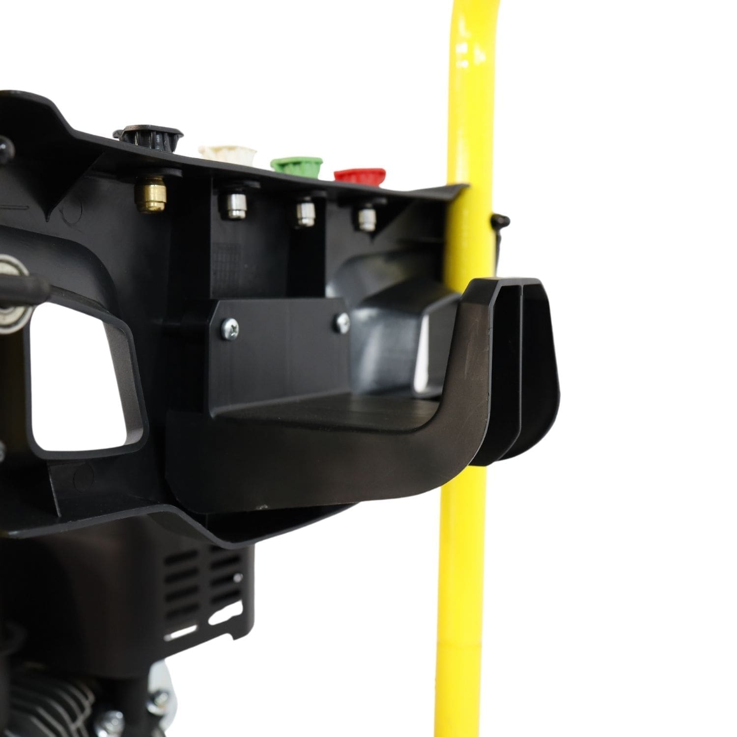 Montada sobre chassis em aço com rodas e pega de transporte, é facilmente deslocável. A estrutura inclui suporte para pistola, bicos e mangueira. A mangueira de 7 metros é reforçada com malha de aço, e a pistola profissional vem com 4 bicos de engate rápido, prontos para qualquer tipo de limpeza.