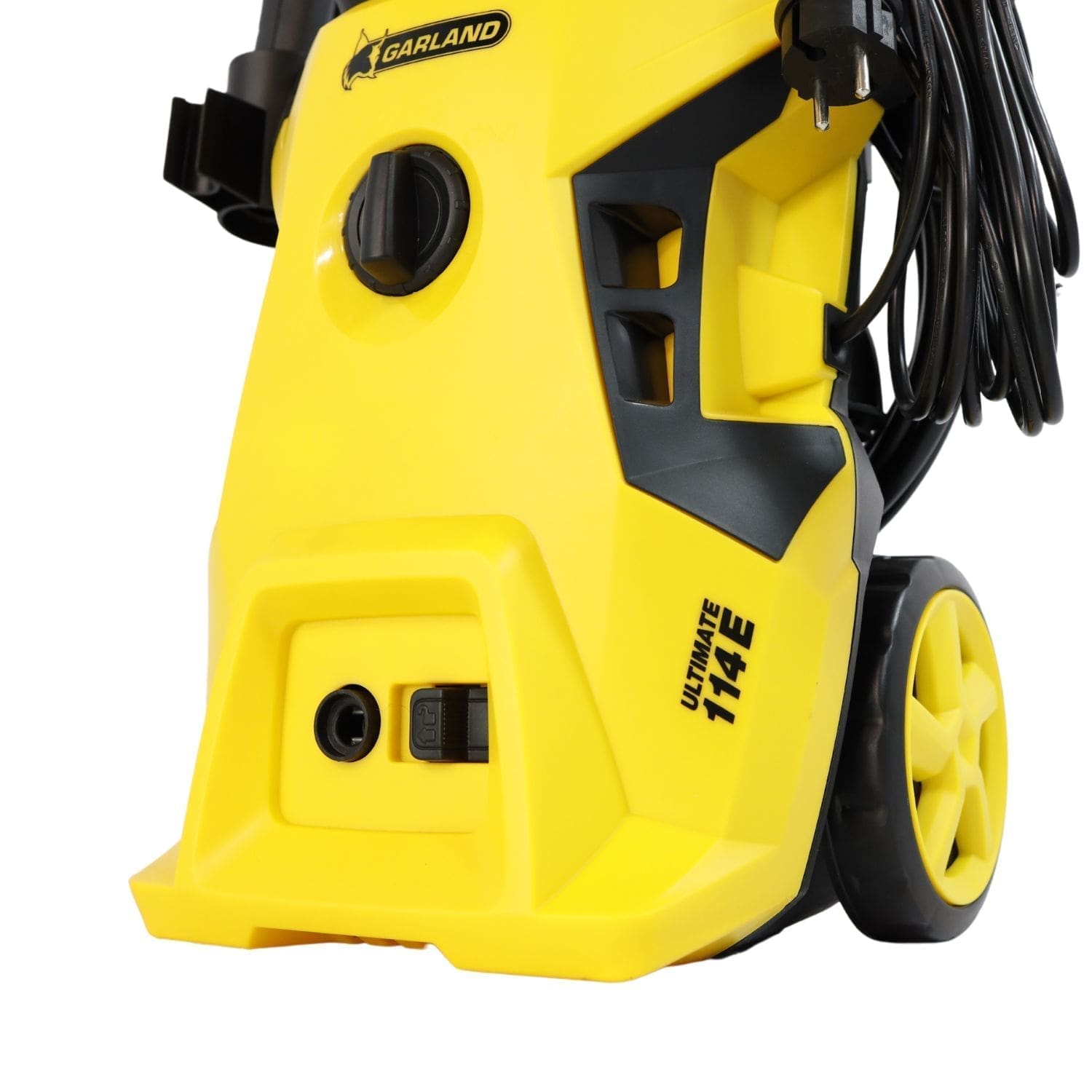 Equipada com pega, rodas de transporte e suporte para cabo e mangueira.