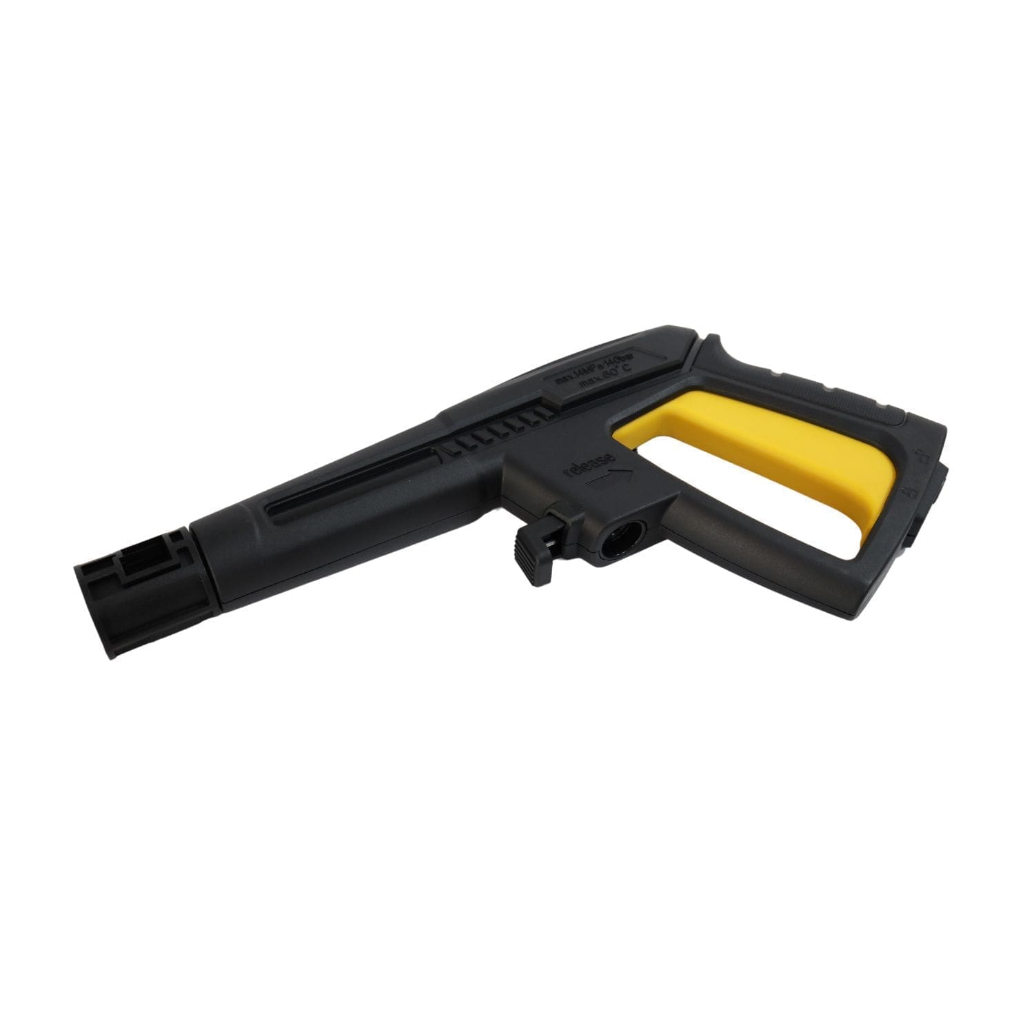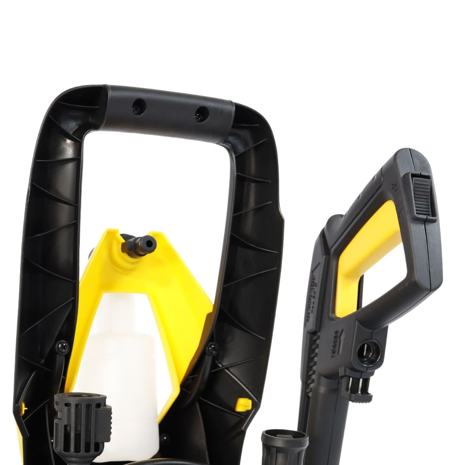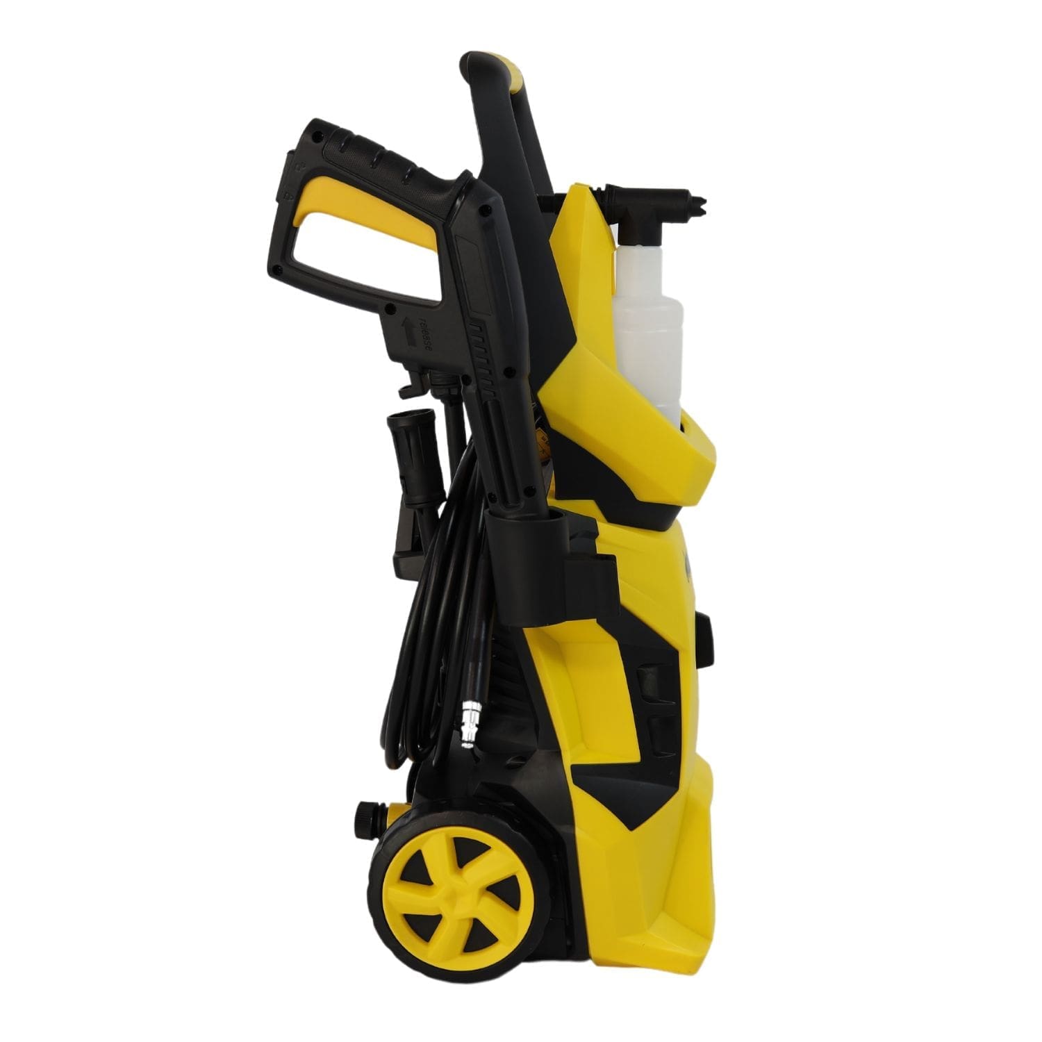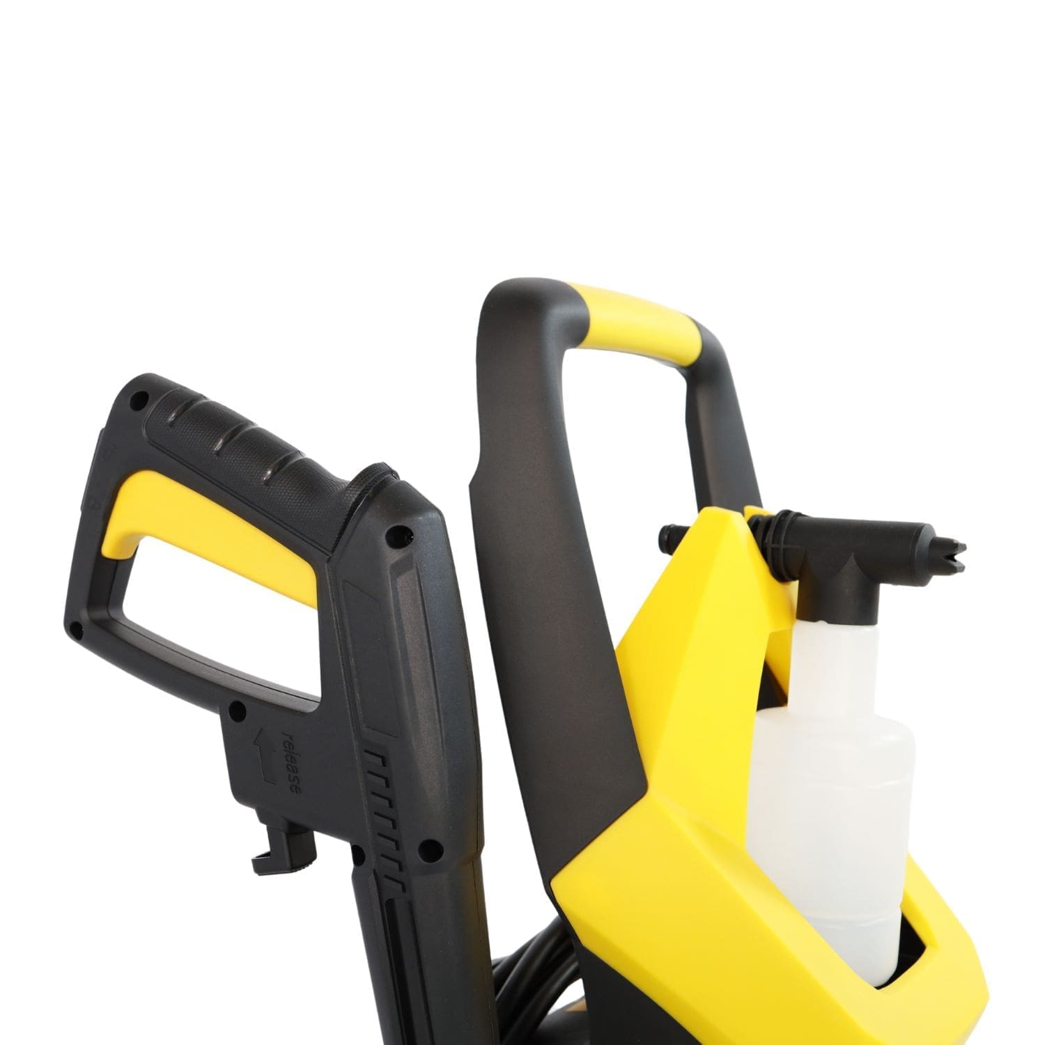 Possui conexão rápida em todos os elementos. Inclui 5 metros de mangueira em PVC, pistola com lança de bico regulável e frasco de detergente.