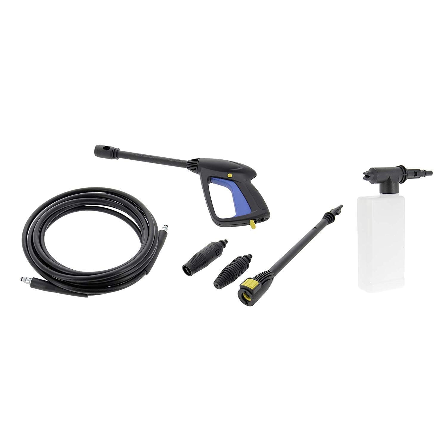 A caixa contém uma pistola, uma lança e uma mangueira de alta pressão (5m de comprimento) para ser conectada à lavadora através do acoplamento rápido “Click Rápido”. Também um bico de jato ajustável que moverá o jato cilíndrico para o ventilador, fortalecendo ou enfraquecendo a potência, o seu bico rotativo remove a sujidade mais difícil e um kit de pistola para o detergente de 0.4L que poderá ser utilizado em baixa pressão.