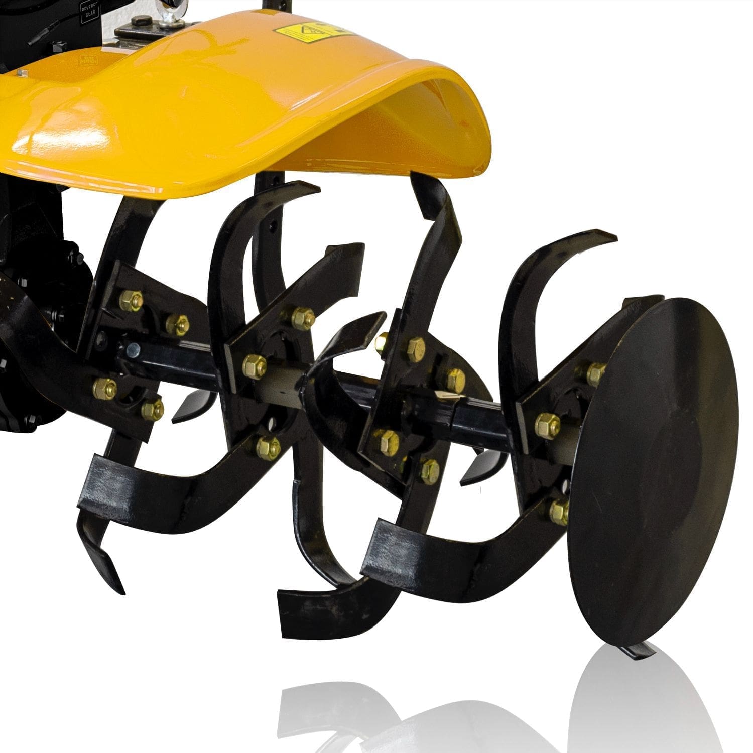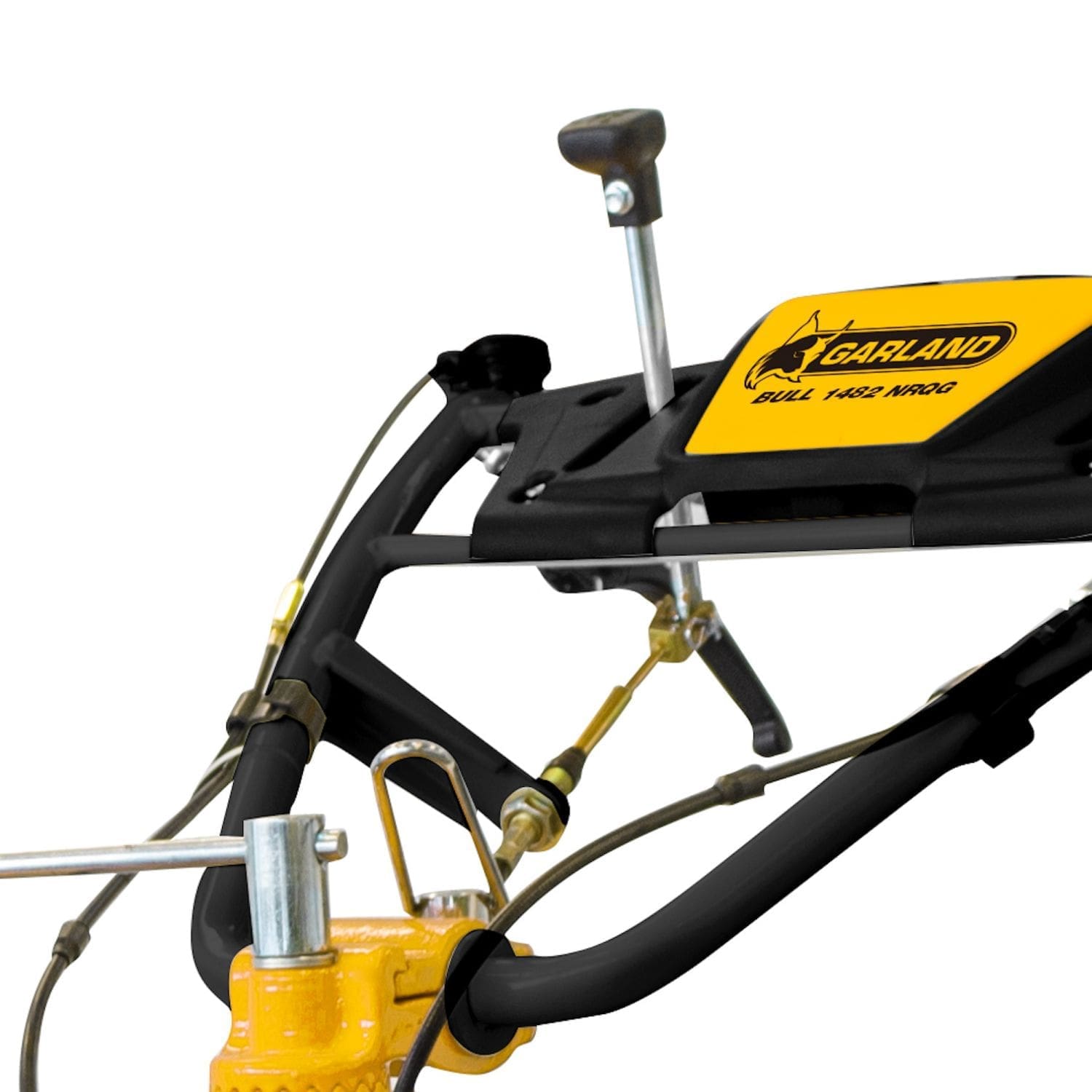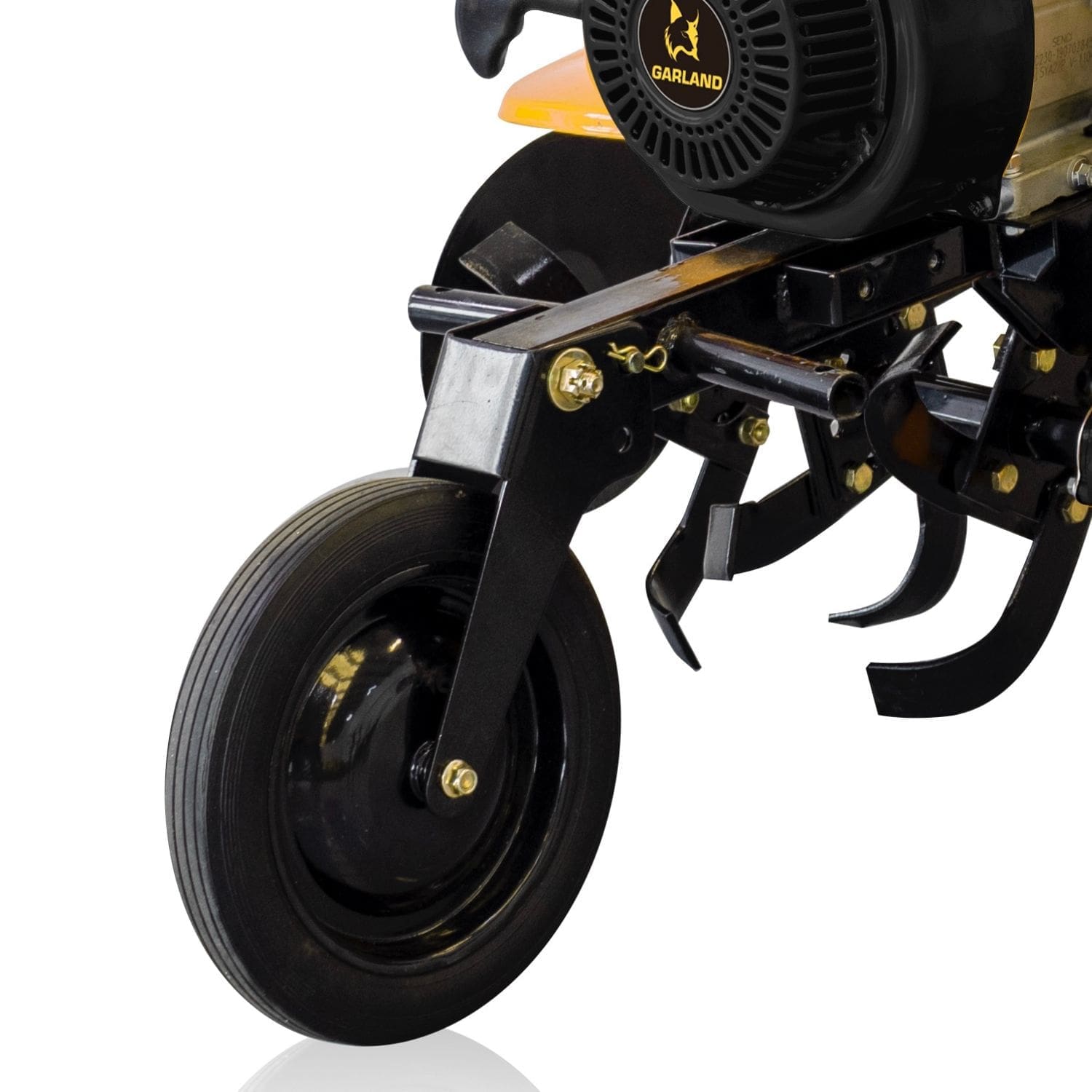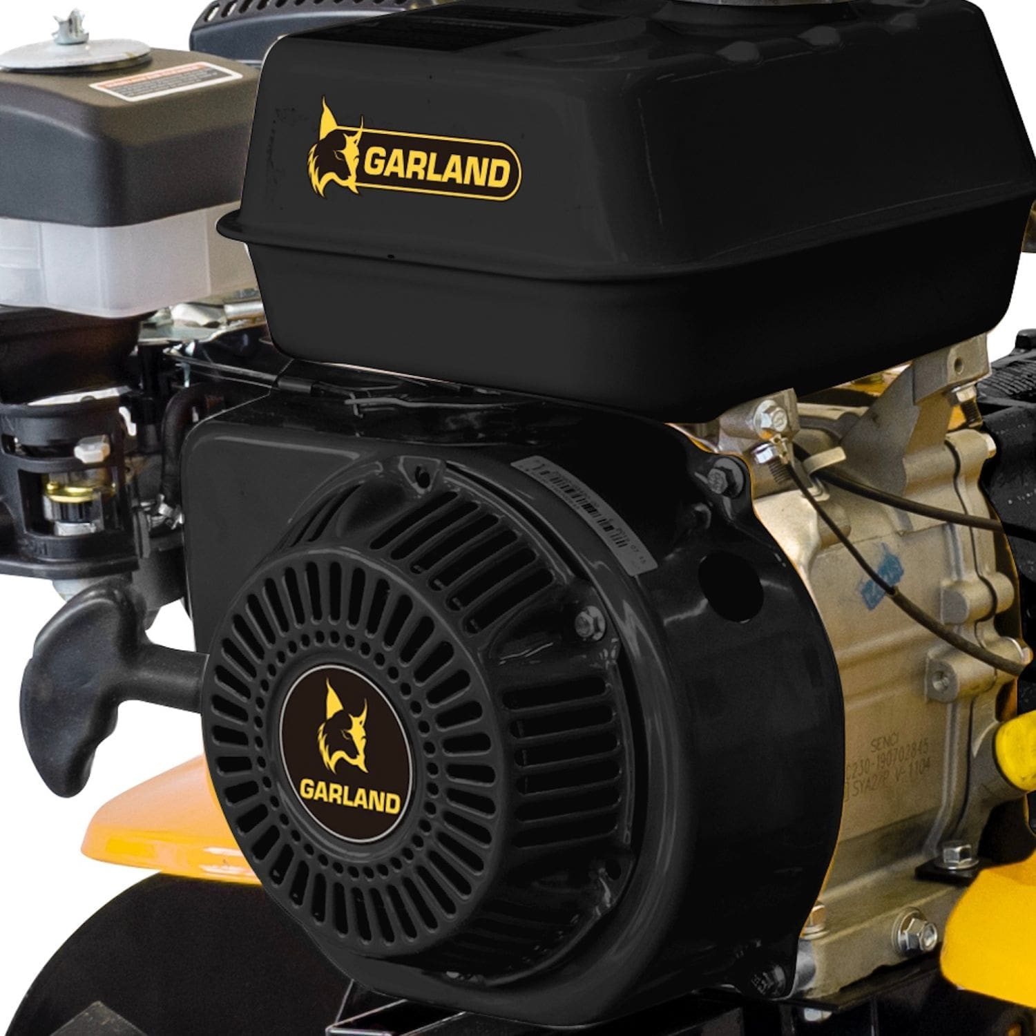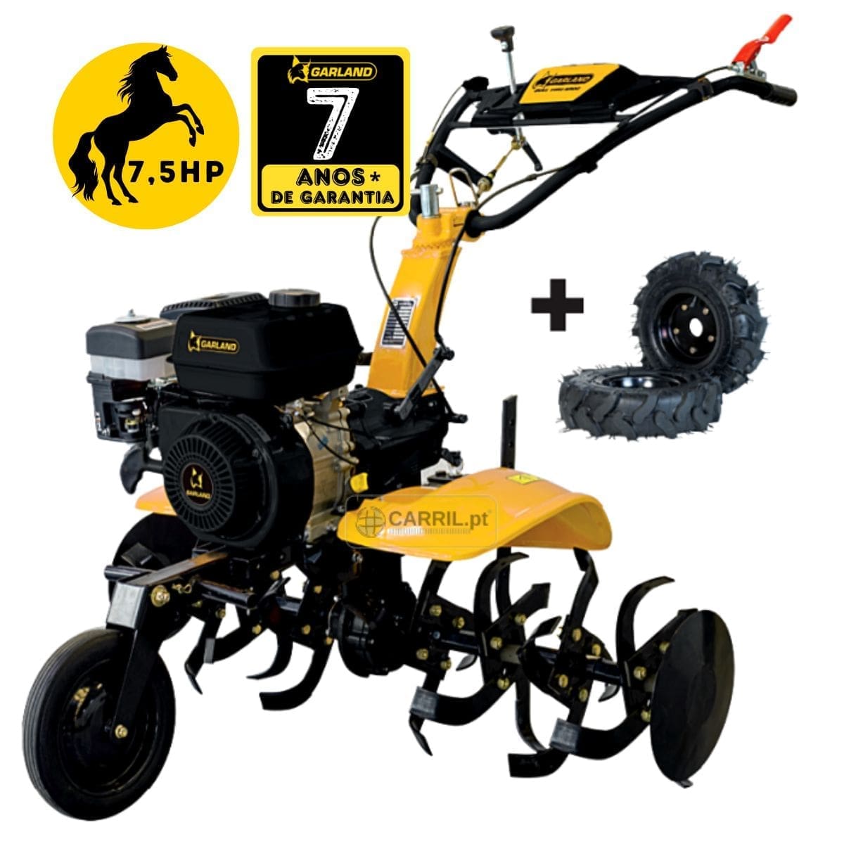 Motoenxada com transmissão primária direta com embraiagem multidisco. Motor Garland OHV com filtro de ar com banho de óleo. Transmissão secundária de ferro fundido com engrenagens de banho de óleo e 2 velocidades à frente e uma atrás. Guiador ajustável em ângulo lateral e altura. Grupo de 8 fresas com eixo hexagonal de 30 mm e secção de facas de 6×40 mm com discos de proteção de plantas. Guiador ajustável em 8 posições.