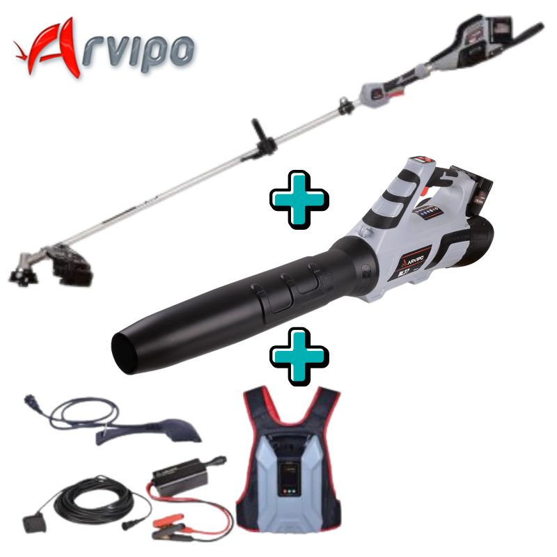 O pack ARVIPO roçadora + soprador com arnês 30Ah combina potência, autonomia e conforto para profissionais de jardinagem. A roçadora BC37 oferece motor brushless de 800W e cabeças de fio e lâmina para cortes exigentes e precisos. O soprador BL37 assegura fluxo até 560 m³/h e modo turbo para limpeza eficiente. O arnês mochila 30Ah, com carregador e cabo genérico, garante até 6 horas de trabalho contínuo com equilíbrio e conforto em todas as tarefas de corte e limpeza.