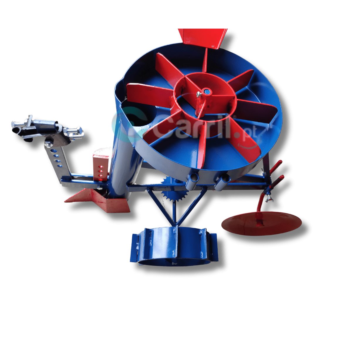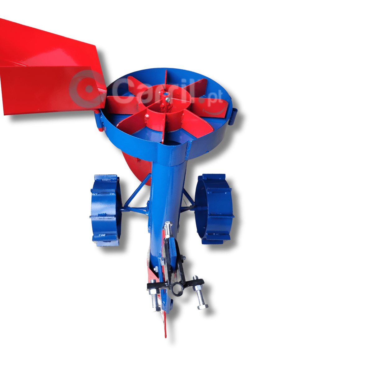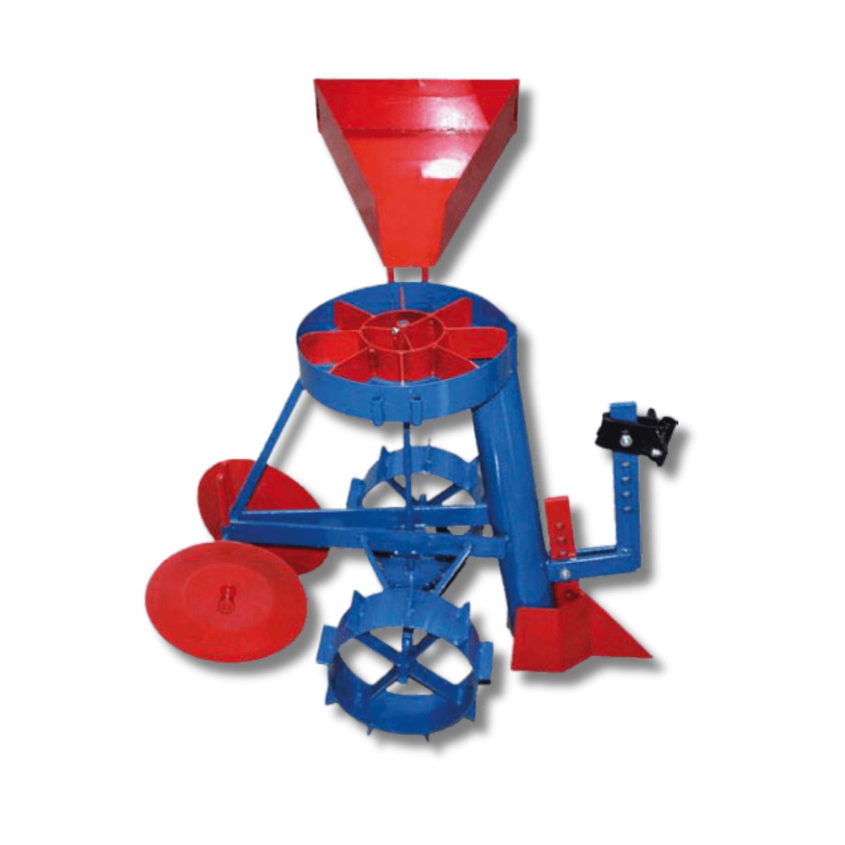 Fabricado em aço robusto, com rodas de ferro para uma maior aderência à terra já lavrada, conta ainda com um abre-regos regulável em altura e, dois discos traseiros para refechar o rego após a queda cuidadosa do tubérculo.