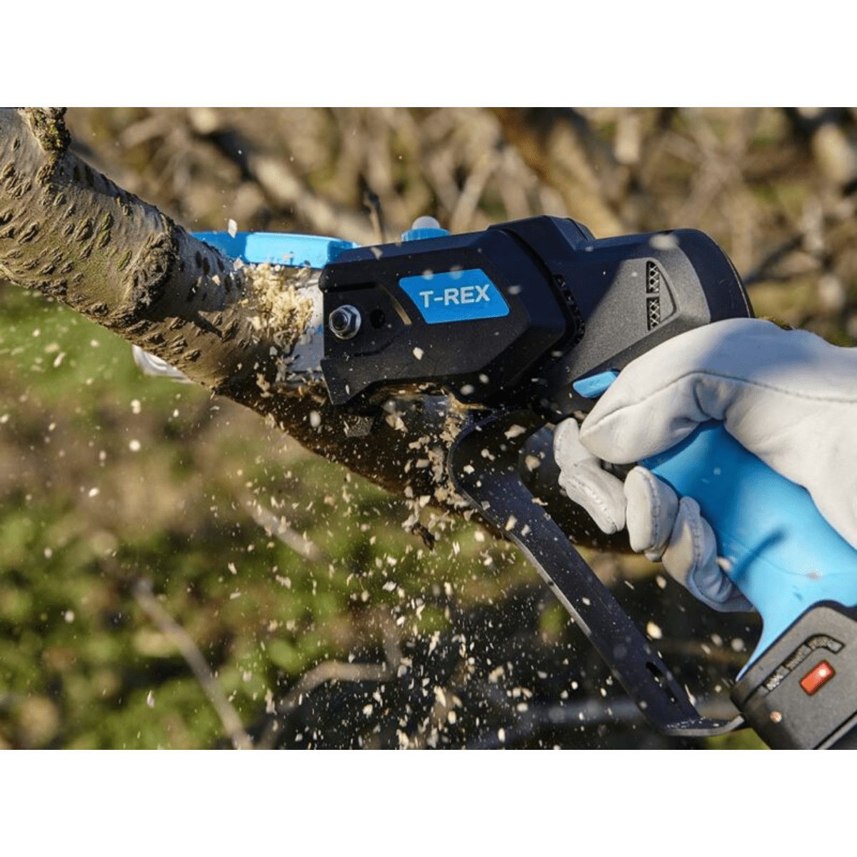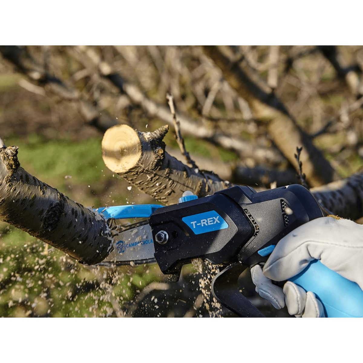 A Podadora T-REX possui alta capacidade de corte em todas as condições de uso e é ideal para poda de árvores frutíferas, vinhas e plantas ornamentais. Tem motor brushless com 470 W de potência e uma corrente de 1/4″ com 29 elos, pode atingir uma velocidade de 8,5 m/seg. As características da podadora são completadas pelo cabo antiderrapante com interruptor de segurança e pelo design ergonômico, que garante ao operador excepcional liberdade de movimentos e mínimo cansaço do braço.